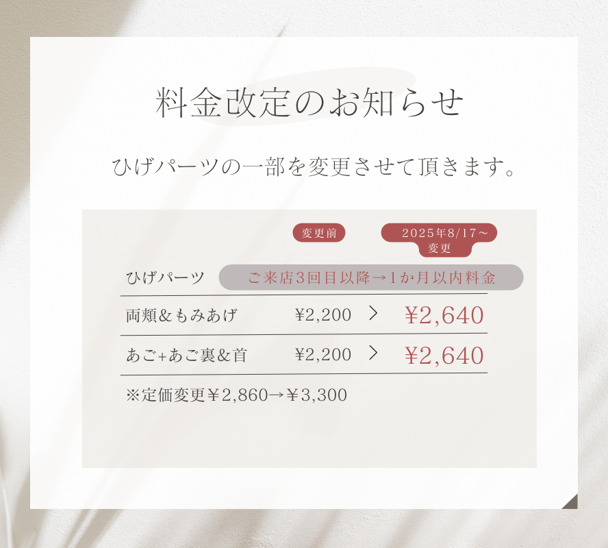 『両頬&もみあげ』と『あご+あご裏・首』の定価¥2860を8/17より¥3300に変更させて頂きます。